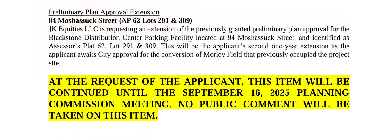 "As Pawtucket’s Planning Commissioners, you can chart a different course, beginning with denying J.K. Equities’ second request for an extension of their preliminary plan to pave Morley Field."