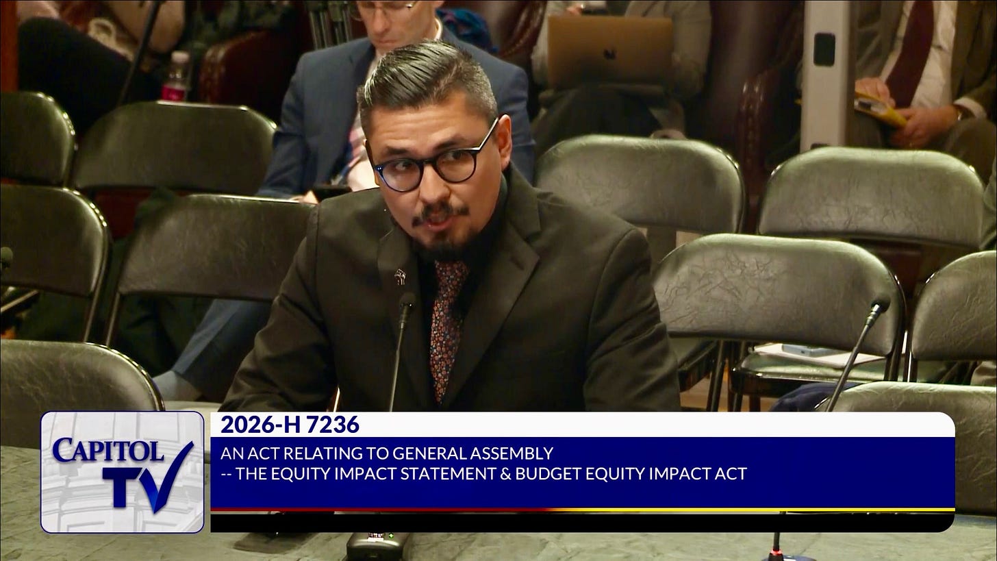“House Bill 7236 would establish a two-year pilot program enabling equity impact statements by empowering the Speaker of the House and the Senate President to select five bills each to receive an equity impact statement,” said Representative David Morales (Democrat, District 7, Providence) to the House Committee on State Government and Elections on Tuesday. “In addition, the Rhode Island Black, Latino, Indigenous, Asian-American, and Pacific Islander Caucus (RIBLIA) may select up to 10 bills. This would be for the duration of the 2027 and 2028 legislative sessions, respectively.
