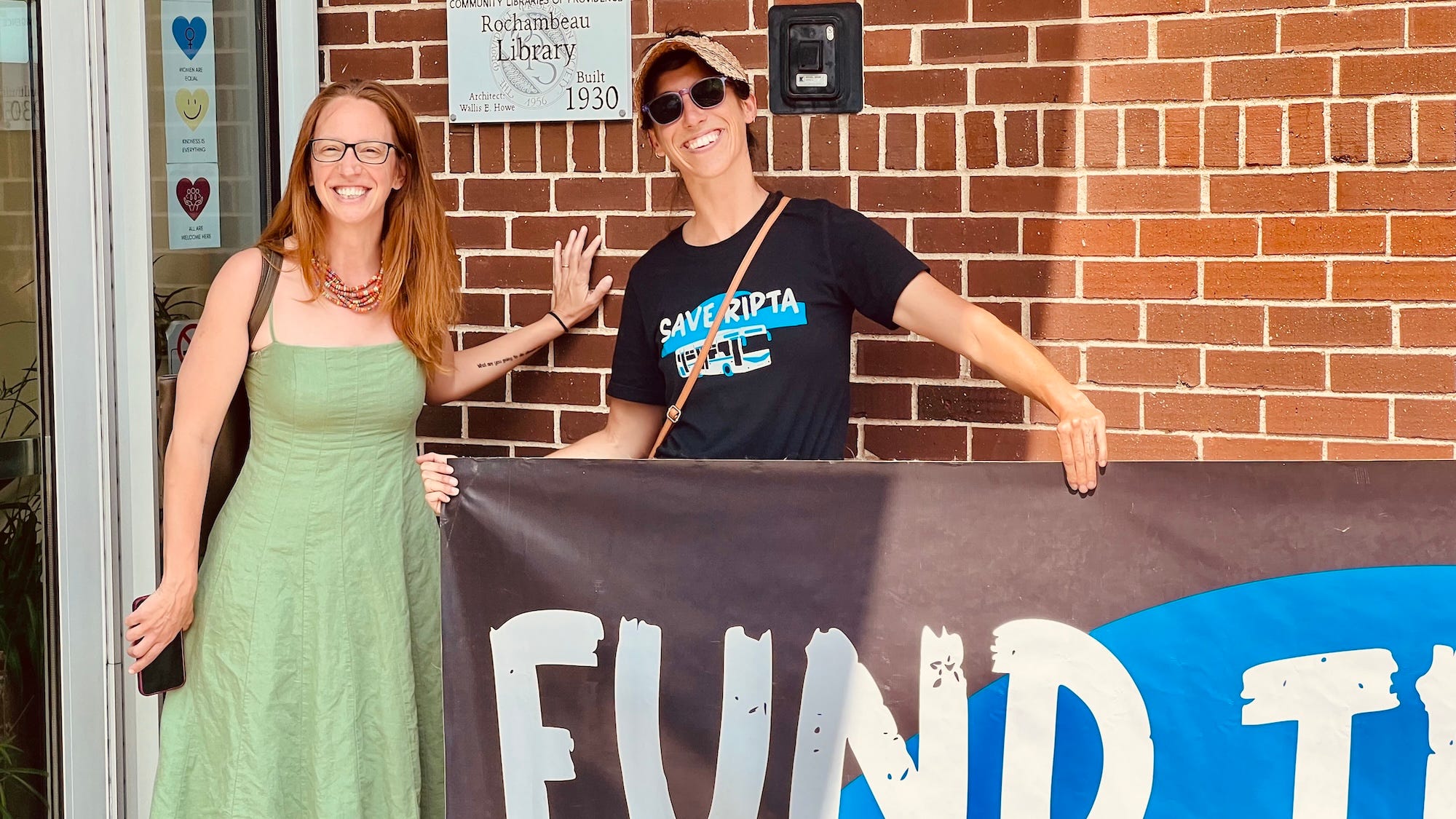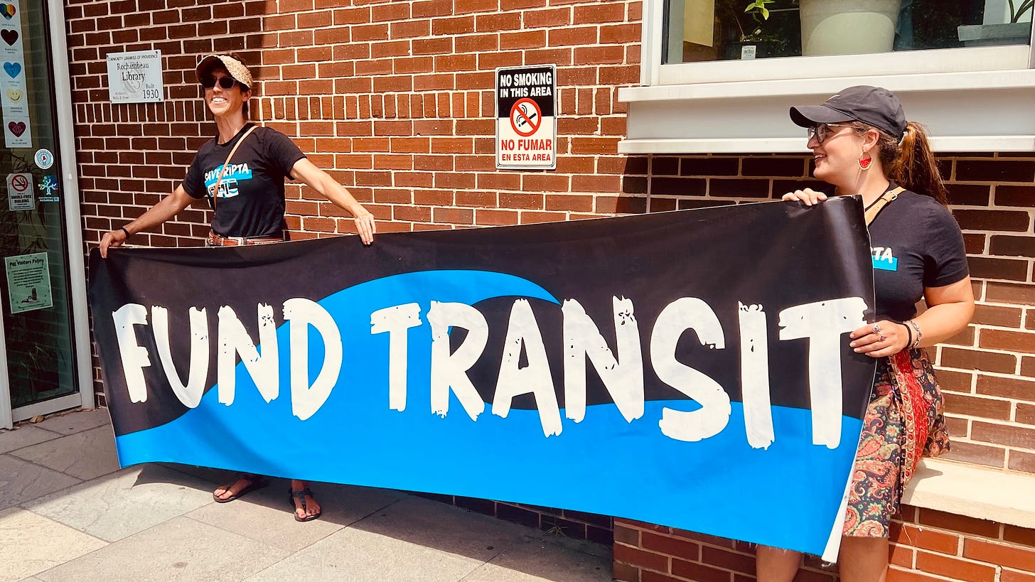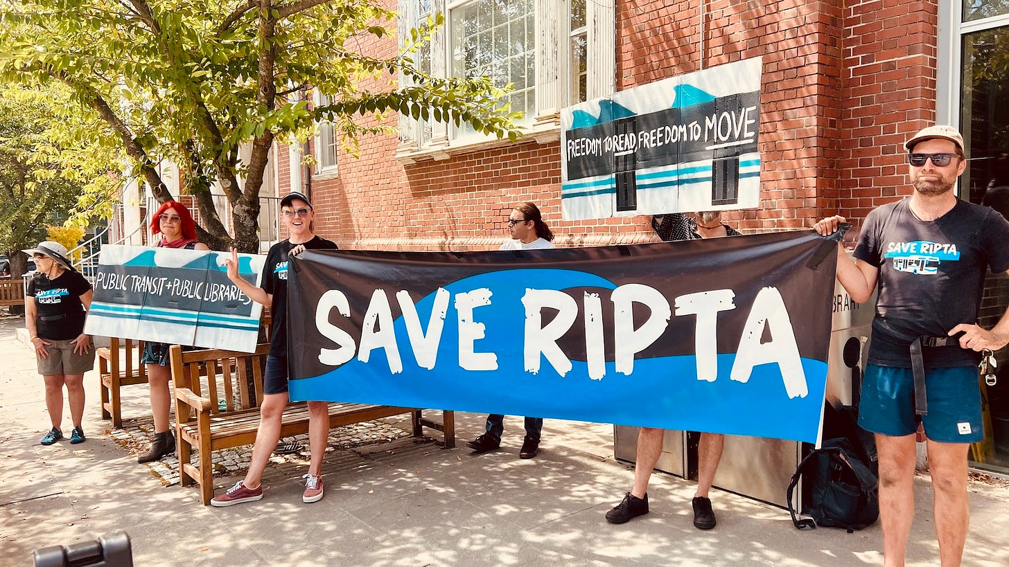 Transit advocates held banners and signs outside the Rochambeau Library on Tuesday morning to send a strong signal to Governor Daniel McKee, House Speaker K. Joseph Shekarchi, and Senate President Valerie Lawson to fully fund the Rhode Island Public Transit Authority (RIPTA) and reverse the severe service cuts that will come if a $10 million funding gap is not covered. The state leaders were at the library to attend the ceremonial signing of the Freedom to Read Act, which I covered here.