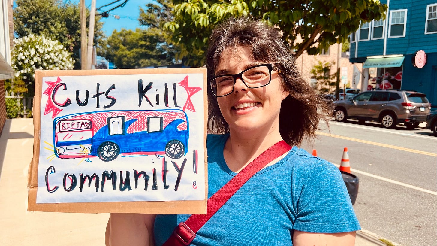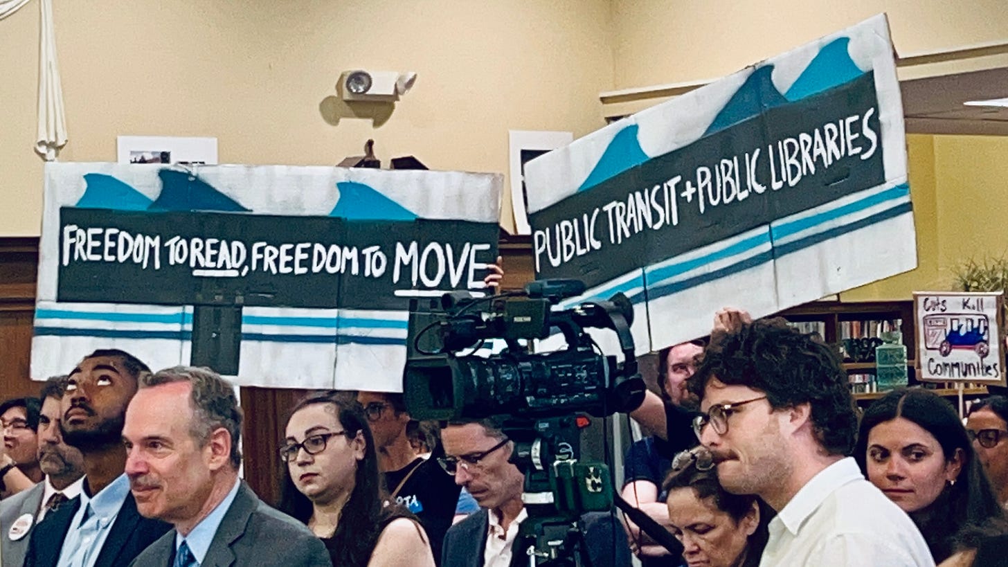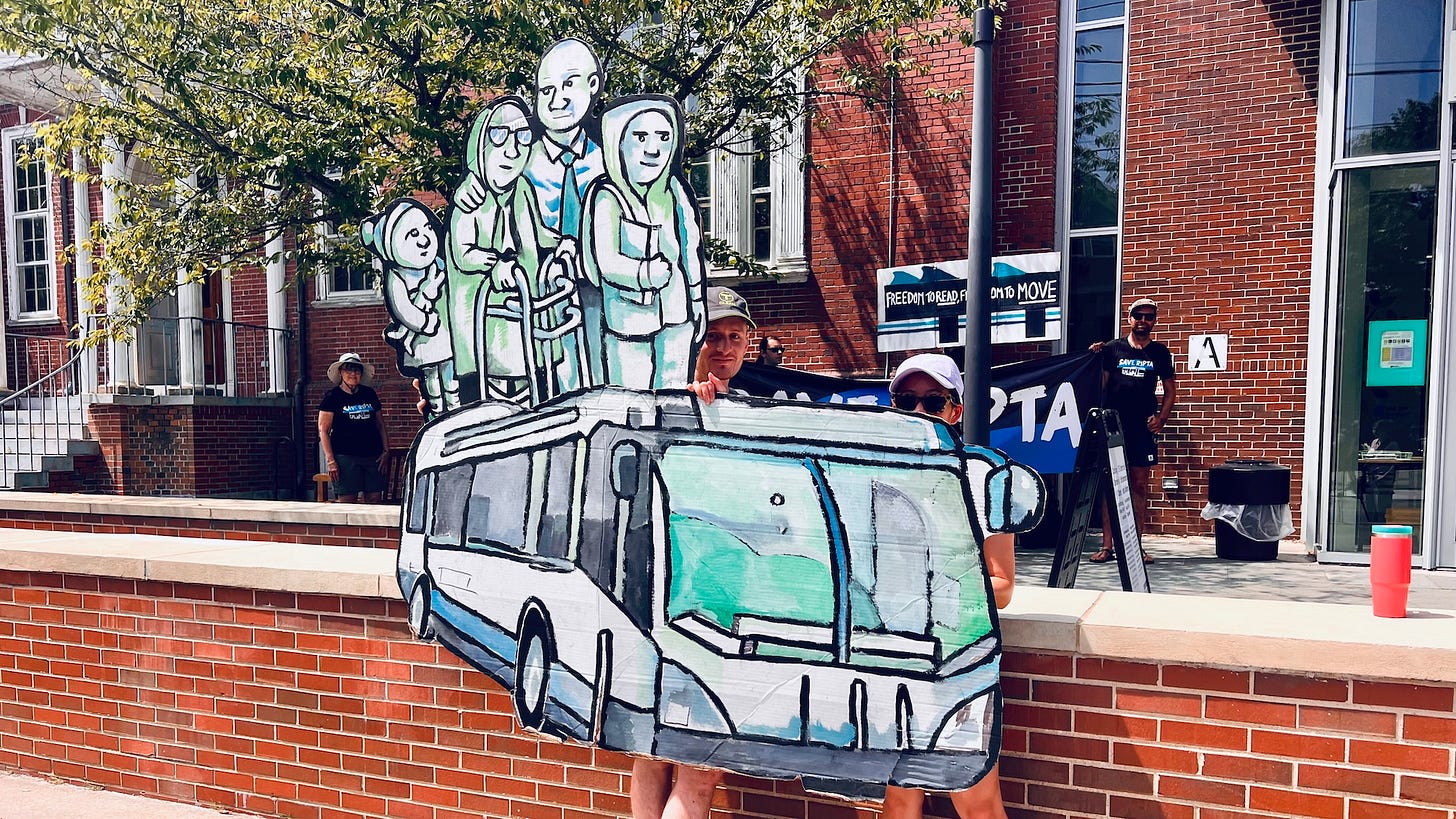 Transit advocates held banners and signs outside the Rochambeau Library on Tuesday morning to send a strong signal to Governor Daniel McKee, House Speaker K. Joseph Shekarchi, and Senate President Valerie Lawson to fully fund the Rhode Island Public Transit Authority (RIPTA) and reverse the severe service cuts that will come if a $10 million funding gap is not covered. The state leaders were at the library to attend the ceremonial signing of the Freedom to Read Act, which I covered here.