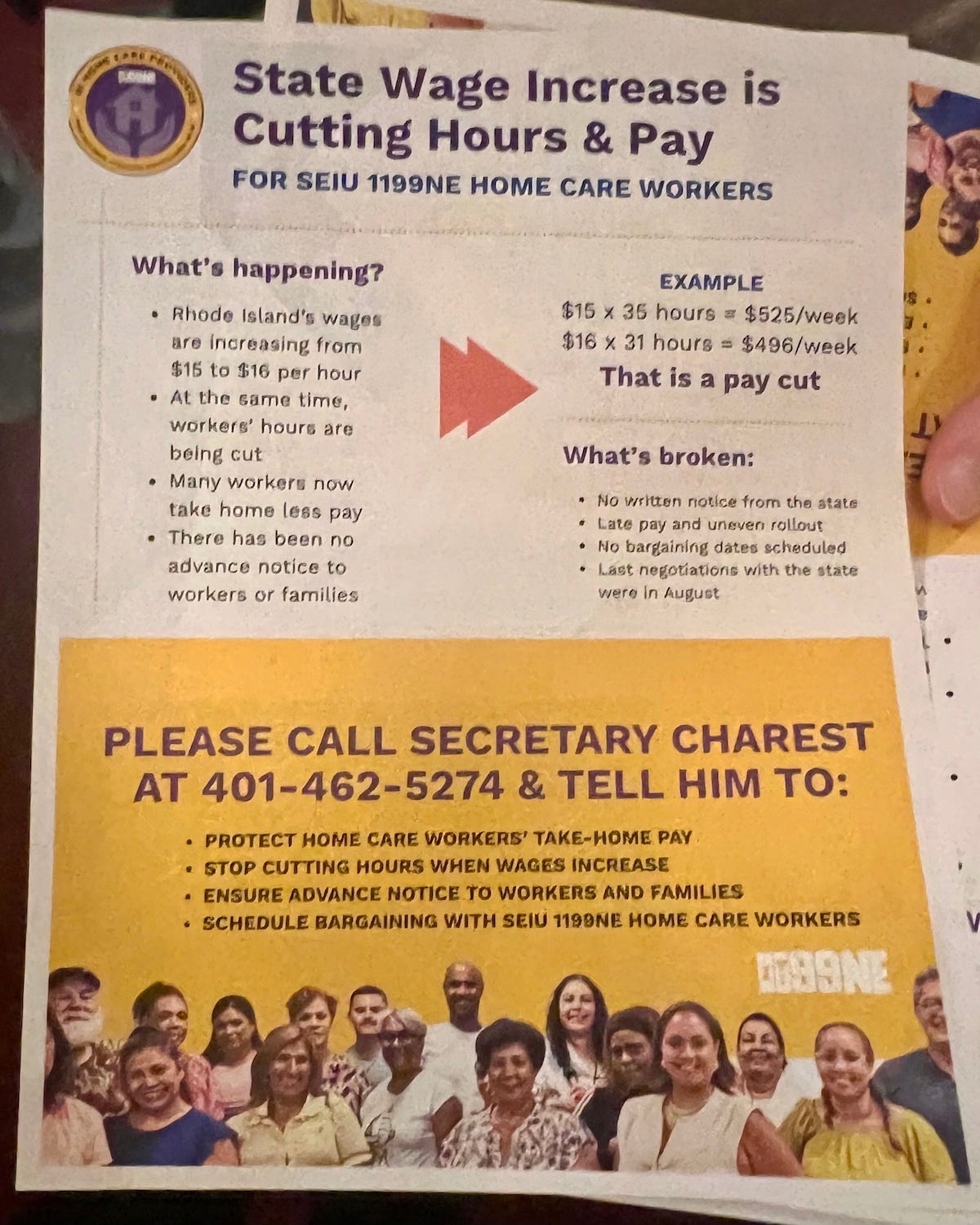 SEIU 1199NE is asking that you call EOHHS Secretary Richard Charest at 401-462-5274 and tell him to: