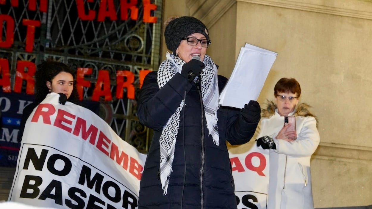“We are the working class. We are the majority. We are the ones who build this country. Without us, nothing moves. That is our power. That is why we are the ones who can stop these wars, believe it or not. People think we’re crazy standing out here in this cold, but you know what? We are the power. We will win this because they can’t make their profits without us. We, the working and oppressed people of the world, are the ones who have the power to stop them. We must remember this. Don’t ever forget this. We must keep showing up. We must be loud, and we must be clear: No war on Iran!