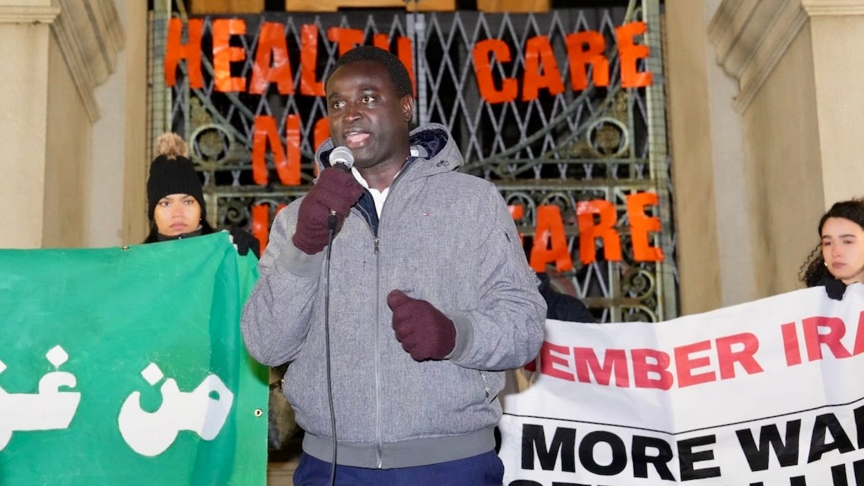 “I am here because I am outraged,” said Omar Bah, founder and former Executive Director of the Refugee Dream Center. “I reject war. I condemn war, and I condemn the aggression against Iran. By the way, not supporting the war against Iran does not mean you are not patriotic. If that makes anybody unpatriotic, then so be it, because I would rather condemn the attack against innocent civilians where children are being bombed in schools than support a war, especially a war that is unjust and not sanctioned by Congress.”