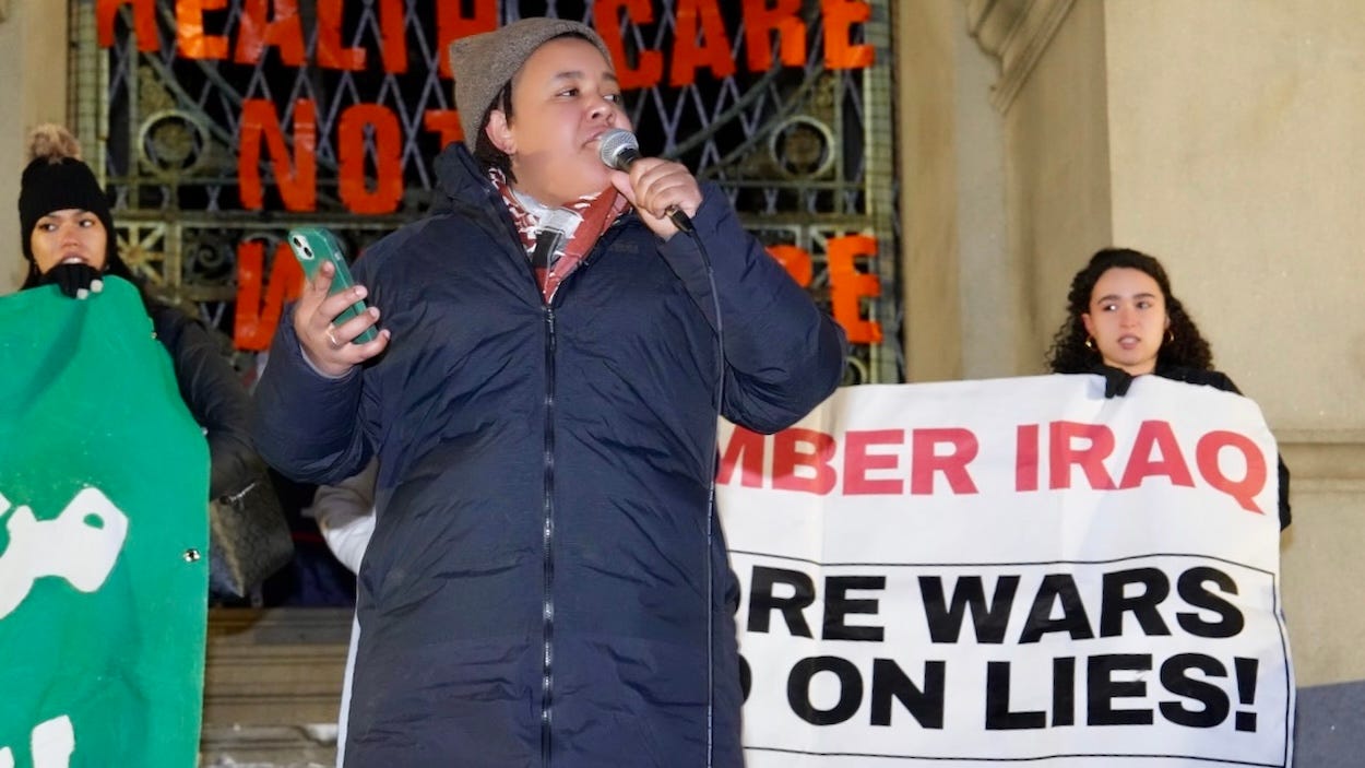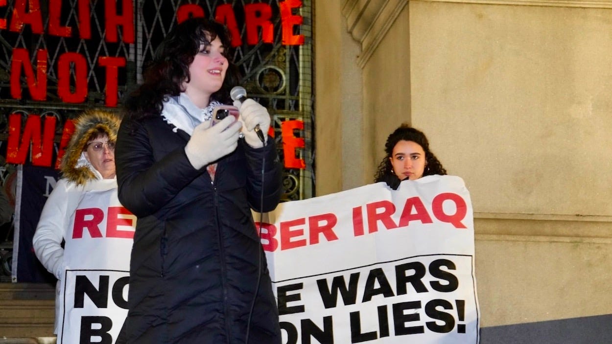 “But this war is not inevitable. Another future is possible. A future built on solidarity, not sanctions, on self-determination, not regime change, on peace, not permanent war. So I ask all of you, are we going to stay home and watch our government start another war in front of our eyes? No! To have the future that is possible and end today’s destruction, we have to fight. That’s why each of us came out here tonight, and that’s why we’re going to be in the streets all across this country until we end not only this war, but all wars. Let’s get loud, let’s get organized, and let’s show them that the anti-war movement is alive and growing, and we will not be divided.”