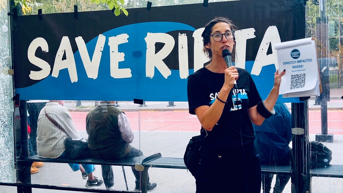 “But together, we can reverse this. All hope is not lost. We are here tonight to hold space for the riders whose lives will be harmed. Unfortunately, it doesn’t seem like there’s anything we can really do about this until January. Last year, so many of you fought alongside us at the State House. You were there late nights, and guess what? We’re going to do it again. We thank the members of the General Assembly who got us an additional $15 million annually for RIPTA. Unfortunately, it wasn’t enough, and the governor was unwilling to make up the gap even as that gap shrank and shrank, from $15 million to $10 million, then down to $4 million, and still nothing from Governor Dan McKee to prevent what is about to happen to communities across our state, so that we say shame.