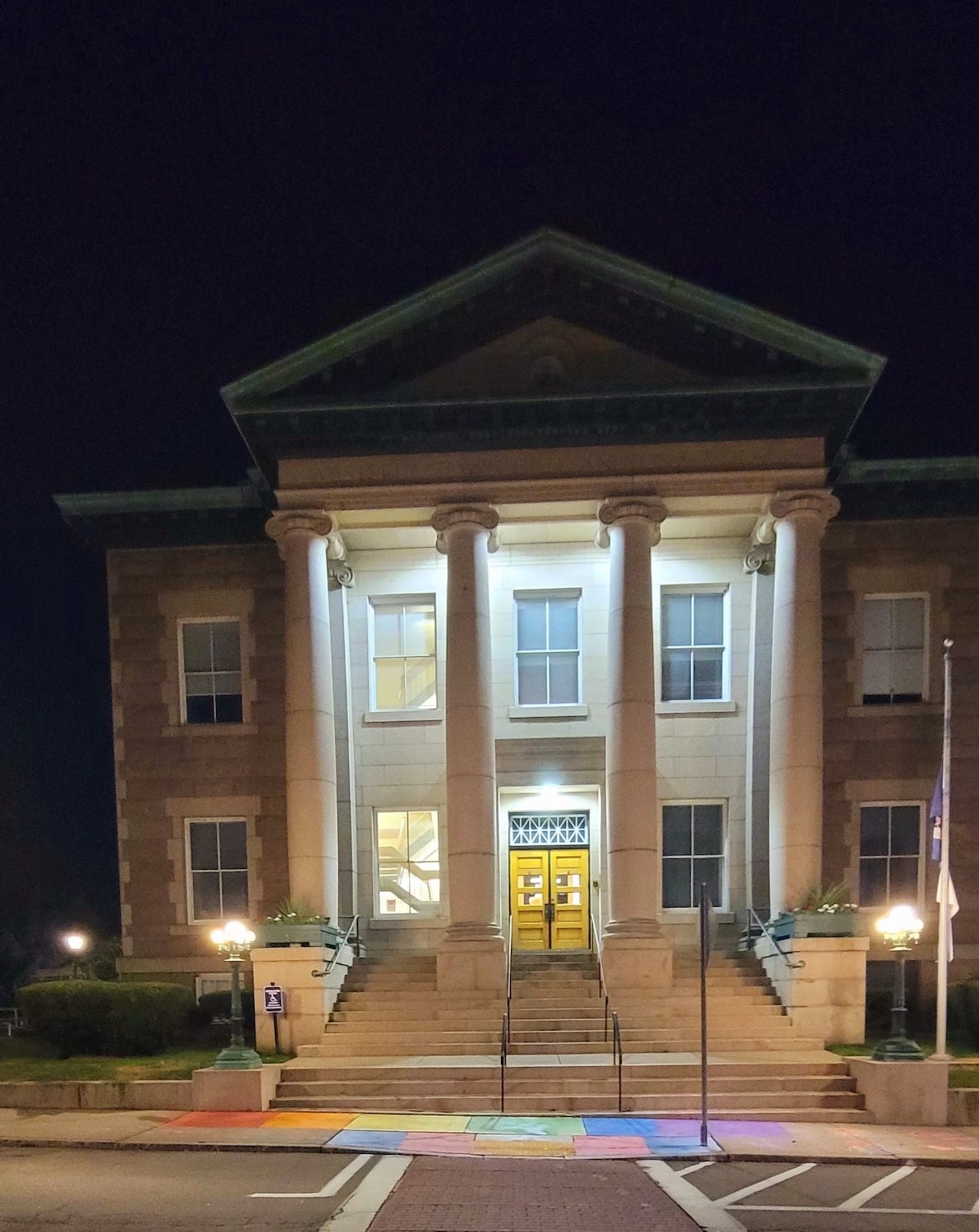 “I drove down from Providence tonight,” said Joanne Rich, “because I heard that the LGBTQ chalk display was removed [Editor: More on this later], and I wanted to make sure that there would be enough voices here tonight on behalf of the vulnerable, queer students in your school system. I’m a retired educator. I’ve known I was queer since I was 13. I used she/they pronouns. Growing up in the seventies and eighties, school was really difficult. Back then, there was not a single out teacher, and no one was out in my high school class of 400 students. I felt like a freak, and I felt invisible.