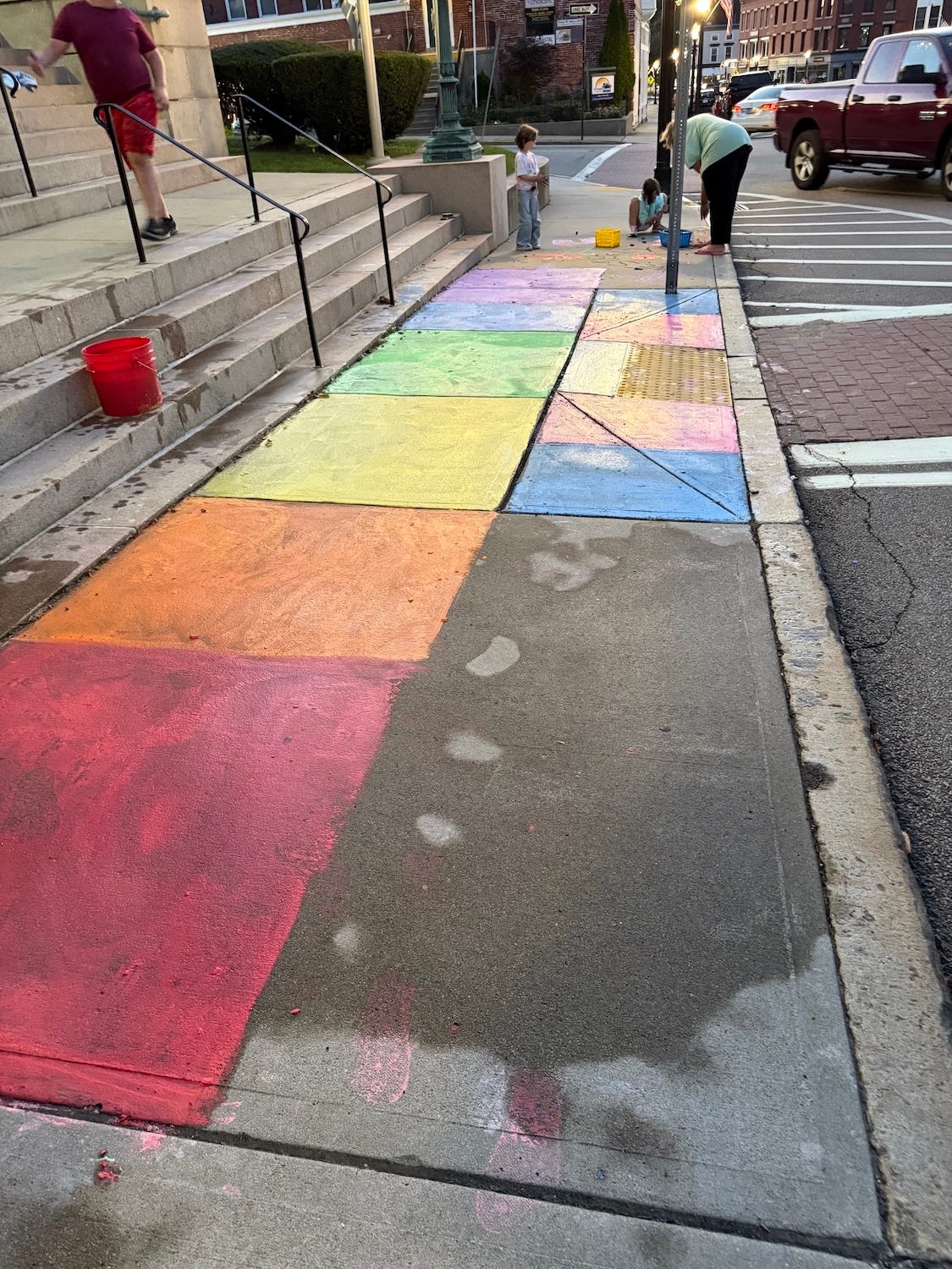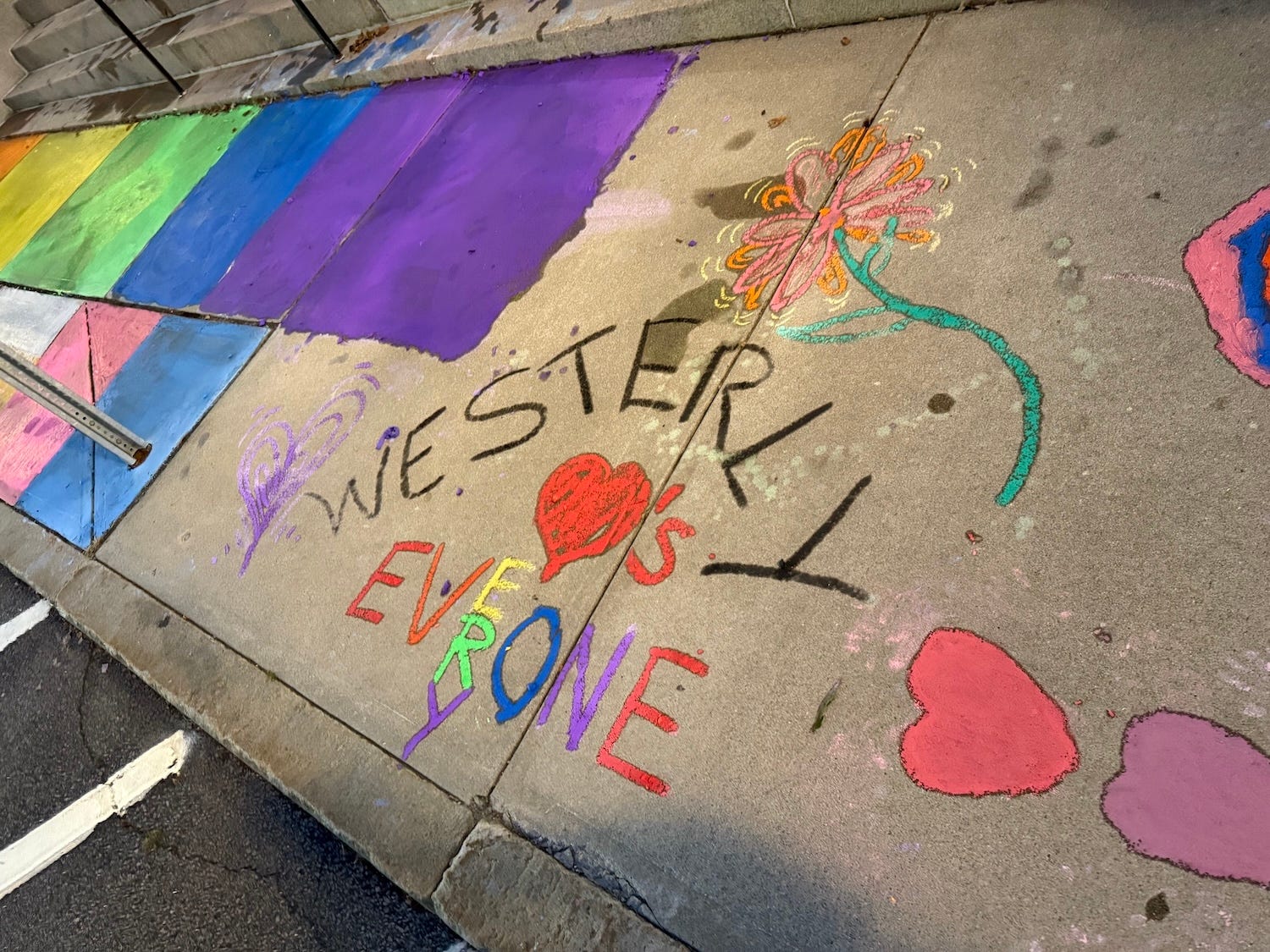 What’s up with the chalk? The day before the School Committee hearing to discuss the school district’s Transgender, Gender Non-Conforming, and Transitioning Students protocol, two members of the school committee, Michal Ober and Angela Goethal, along with Town Councilmember Alexandra Healy, used chalk to decorate the sidewalk in front of the Westerly Town Hall with rainbows and messages of acceptance.